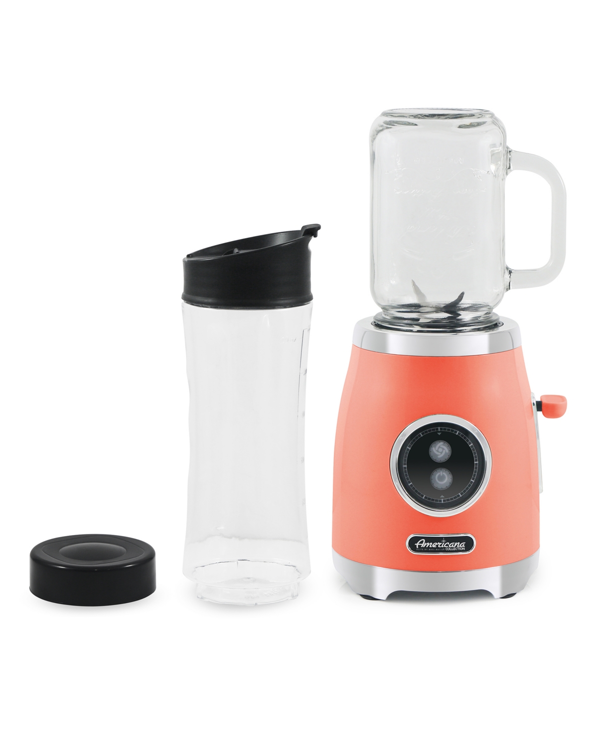 Enjoy your favorite shakes, fruit smoothies, or power packed protein drinks with the Americana Collection by Maxi-Matic Retro Personal Blender. Comes with one 16 oz glass mason jar & lid and a 20 oz sports bottle with drinking lid so you can enjoy your tasty creations on the go. The blender has a powerful 300 W motor and is easy to store. The handy pulse lever makes it easy to start and stop the machine. The power indicator illuminates when the blender is ready to use.
